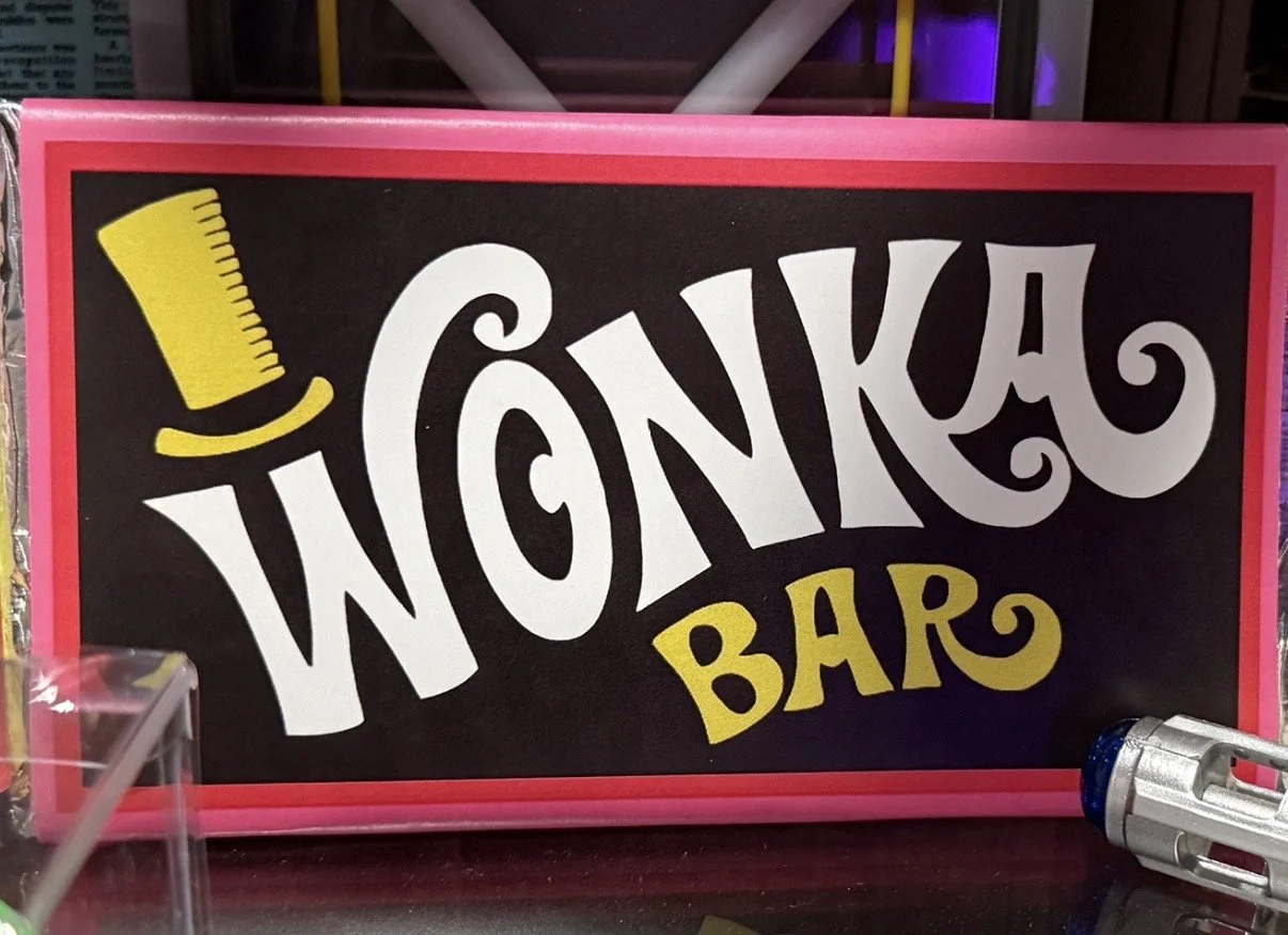 The chocolate bar prop became one of the most recognizable objects in the film. Its wrapper features playful, whimsical lettering spelling “Wonka Bar,” accompanied by a small top hat graphic that serves as a subtle reference to the eccentric chocolatier himself. The design reflects the film’s imaginative tone and its nostalgic confectionery aesthetic.