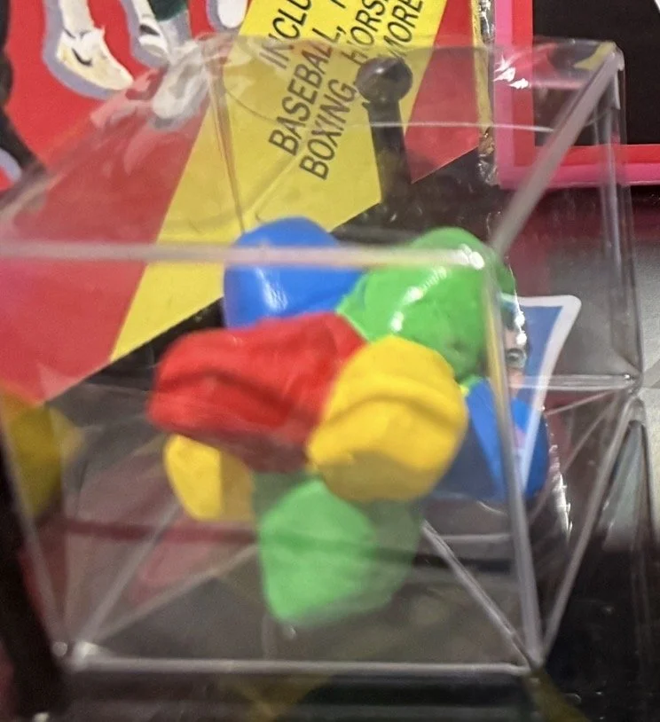 The candy itself appears as a cluster of brightly colored geometric shapes—reds, blues, greens, and yellows—giving it a playful and slightly mysterious appearance that fits the imaginative world of Wonka’s factory. This replica captures the distinctive look of the prop from the film and serves as a tribute to one of the story’s most memorable symbolic objects.